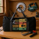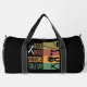 This black duffle bag features a clever twist on a classic game, showing "ROCK PAPER SCISSORS TABLE SAW" with corresponding tool graphics: a hammer/wrench, hand saw, pliers, and a table saw icon. With colourful striped panels, it's a perfect humourous gift for carpenters, woodworkers, and DIY enthusiasts who love their tools. Edit colour of the bag caps and body in the Design tool to your favored colours.