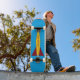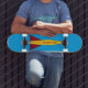 The Rocket AD8 skateboard features the picture of a colourful rocket, yellow with red fins, on a blue background for the high flying skateboarder brave enough to ride it.
