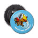 A round bottle opener, featuring a cartoon adrenaline junkie tortoise in a crash helmet, swooping through the clouds with a large jet engine strapped to his back. A dynamic, upbeat image, drawn for fun. It could be about not accepting the limitations life hands to you; a cute cartoon for lovers of extreme sports; or an image for tortoise owners and enthusiasts. The default text is "ROCKET FUEL OPENER", change to your preferred name, message or caption.