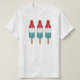 Tee shirt features a row of three patriotic red, white, and blue 'rocket pop' popsicles. A delicious summertime frozen treat!