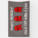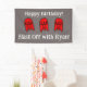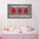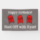 This adorable red rocket ship birthday party design features WindyDesign's hand-drawn artwork and the words "Happy Birthday, Blast off with....." on a grey background.