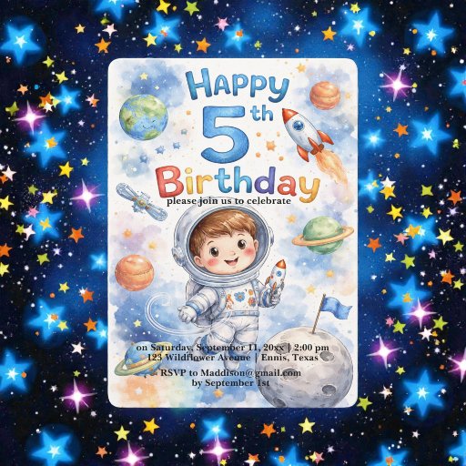 Blast off into an unforgettable celebration with this adorable 5th Birthday Astronaut Watercolor Invitation! Featuring a sweet smiling astronaut boy floating in space, surrounded by colorful planets, stars, and rockets, this design is perfect for little space explorers who dream of adventures beyond the stars.
