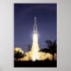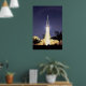 2D illustration of rocket taking off with palm trees silhouetted in the foreground.