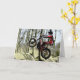 A birthday card for motorbike trial fans and competitors with a posterised action photo of a motorcycle trials rider jumping from rock to rock.