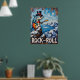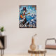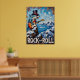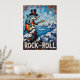 This whimsical artwork features a cool shark wearing a top hat and sunglasses, playing an electric guitar on a snowy mountain overlooking a blue, icy sea. The background shows distant snow-capped peaks under a cloudy sky. The painting uses thick, textured brushstrokes, giving a playful yet dynamic feel to the scene, with "ROCK and ROLL" emblazoned below.