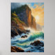 A dramatic tableau unfolds as a tall rocky cliff stands guard above the tumultuous sea. The waves crash against the unyielding stone, their fury a testament to the power of nature's forces. Amidst the chaos, the cliff stands resolute, a silent witness to the eternal dance between land and sea.