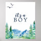 This rocky mountain baby shower it's a boy sign is perfect for an outdoor baby shower. The design features a blue and green painted wilderness landscape with watercolor pine trees, birds and mountains.