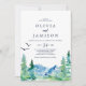 This rocky mountain casual destination wedding invitation is perfect for an outdoor wedding. The design features a blue and green painted wilderness landscape with watercolor pine trees, birds and mountains.