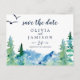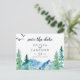 This Rocky Mountain destination save the date postcard is perfect for an outdoor wedding. The design features a blue and green painted wilderness landscape with watercolor pine trees, birds and mountains.