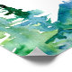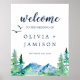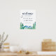 This Rocky Mountain destination wedding welcome poster is perfect for an outdoor wedding. The design features a blue and green painted wilderness landscape with watercolor pine trees, birds and mountains. Customise the poster with the name of the bride and groom, and the date of the wedding.