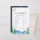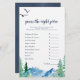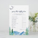 This rocky mountain "guess the right price" game is perfect for an outdoor baby shower. The design features a blue and green painted wilderness landscape with watercolor pine trees, birds and mountains.