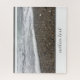 This design in natural earthy colours of grey and brown centre around a seaside photo. In this image is white water from an ocean wave, which has broken and is gently rolling on the shoreline. There is custom text on this piece to personalise it.