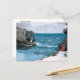 A postcard with the fine art watercolor painting by Winslow Homer titled, Rocky Shore, Bermuda (1900). A cove in the Caribbean with brilliant blue water and rocky cliffs.