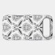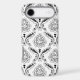 A vintage style decorative damask surface pattern influenced by rococo classical design in black line and leaf fill details on a white background.