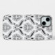 A vintage style decorative damask surface pattern influenced by rococo classical design in black line and leaf fill details on a white background.