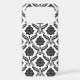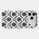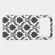 A vintage style decorative damask surface pattern influenced by rococo classical design in black detail on a white background.