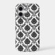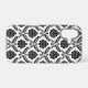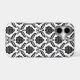 A vintage style decorative damask surface pattern influenced by rococo classical design in black detail on a white background.