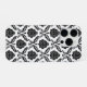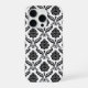 A vintage style decorative damask surface pattern influenced by rococo classical design in black detail on a white background.