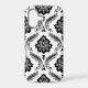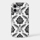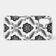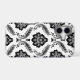 A vintage style decorative damask surface pattern influenced by rococo classical design in black and grey details on a white background.