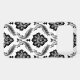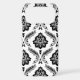 A vintage style decorative damask surface pattern influenced by rococo classical design in black and grey details on a white background.
