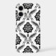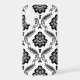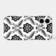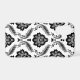 A vintage style decorative damask surface pattern influenced by rococo classical design in black and grey details on a white background.