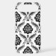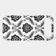 A vintage style decorative damask surface pattern influenced by rococo classical design in black and grey details on a white background.