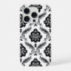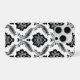A vintage style decorative damask surface pattern influenced by rococo classical design in black and grey details on a white background.