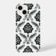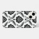 A vintage style decorative damask surface pattern influenced by rococo classical design in black and grey details on a white background.
