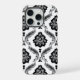 A vintage style decorative damask surface pattern influenced by rococo classical design in black and grey details on a white background.