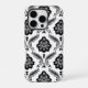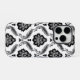 A vintage style decorative damask surface pattern influenced by rococo classical design in black and grey details on a white background.