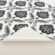 A vintage style decorative damask surface pattern influenced by rococo classical design in black and grey details on a white background.