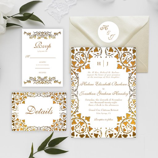 This classy and eye-catching Rococo Vintage Elegant Classic Formal Wedding Invitation features beautiful calligraphy and a sophisticated monogram, adding a traditional touch to your special day. The elegant design is complemented by delicate gold vines, creating a timeless look that your guests will adore. Whether you're planning a large celebration or an intimate gathering, this stylish invitation balances both modern trends and traditional elegance. Perfect for a fall wedding, the design will effortlessly elevate your wedding stationery. Order yours and make your wedding day extraordinary with our exquisite floral invitation.