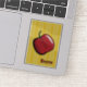 A red rocoto chilli pepper is decorated with patterns inspired by the colourful textiles of Peru and sits on a yellow background with a smaller version of the same pattern and a script label in the corner. This spicy pepper is eaten in Peru and Bolivia and has been cultivated in the area since pre-Incan times.