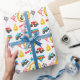 Several cute monster trucks in colours of red, blue, and green are the feature in the pattern on this cute wrapping paper for a little boy. Along with the truck images are stars, fire flames, chequered flags, and text that says "Monster" and "Roll On". Add his own name in blue to personalise it just for him. If you wish to remove the name, just clear the field.