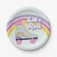 Retro roller skating birthday party plates with 70's style fonts and colours, rainbow and daisies.