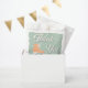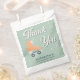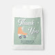 Cute sage green roller skating birthday party favour gift bags featuring "Thank You" in a 70's style script and a retro-inspired illustration of a light orange roller skate. Personalise with her name, age and party date in simple teal blue typography.