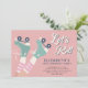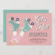Fun pastel pink roller skating birthday party invitation for any age featuring "Let's Roll!" in a white script and a retro-inspired illustration of teal roller skates on a girl wearing pink-striped tube socks. Add her name and birthday year in blue typography.