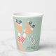 Cool sage green roller skating birthday party paper cups featuring a retro-inspired illustration of pastel orange roller skates on a girl wearing red and white striped tube socks and "Let's Roll" in a white script. Add her name dark teal blue typography.