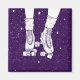 An illustration of a woman or girl roller skating at night. Their feet and roller skates are in the purple, star filled, night sky above a forest.