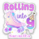 This cute and purple design features the phrase "Rolling Into 9". It is perfect for a roller skater's birthday celebration.