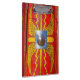 Red decorated Roman Empire military shields scutums in a row and the text INVINCIBLE on t-shirts. Prints and gifts for fun and good mood.