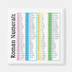 A magnet that has the roman numerals for 1 through 100 on it. Comes in very handy when you are trying to figure out what the roman numerals stands for on something. Also comes in handy as a great teaching aid for children and adults. Has the words "Roman Numerals" along the left side, then to the right it has the regular numbers in the colour strips and to the right of each colour strip is the roman numeral for that number.