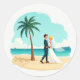 Includes 20 small stickers on one sheet. Adorable illustration of a couple in wedding attire sharing a romantic moment on a sandy beach with a palm tree and clear blue ocean in the background.