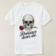 A striking vector art illustration of a human skull with a rose between the teeth with "Romance never die" written bellow it.