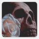 A beautiful and romantic full rose sit beside a human skull in this dark, black and peach-toned photograph. Photograph © Shannon Workman