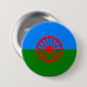 This design features the Romani flag, which is the international flag of the Romani people. The flag consists of a background of blue and green, representing the heavens and earth, respectively; it also contains a 16-spoke red chakra, or cartwheel, in the centre, which represents the itinerant tradition of the Romani people and is also an homage to the flag of India. The flag was approved by the representatives of various Romani communities at the first World Romani Congress (WRC), held in Orpington in 1971.
