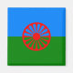This design features the Romani flag, which is the international flag of the Romani people. The flag consists of a background of blue and green, representing the heavens and earth, respectively; it also contains a 16-spoke red chakra, or cartwheel, in the centre, which represents the itinerant tradition of the Romani people and is also an homage to the flag of India. The flag was approved by the representatives of various Romani communities at the first World Romani Congress (WRC), held in Orpington in 1971.