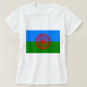 This design features the Romani flag, which is the international flag of the Romani people. The flag consists of a background of blue and green, representing the heavens and earth, respectively; it also contains a 16-spoke red chakra, or cartwheel, in the centre, which represents the itinerant tradition of the Romani people and is also an homage to the flag of India. The flag was approved by the representatives of various Romani communities at the first World Romani Congress (WRC), held in Orpington in 1971.
