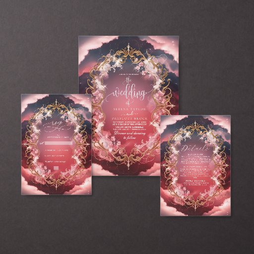 Romantic Baroque Themed Mystic : An exquisite and luxurious wedding invitation design, featuring a floral motifs, intricately intertwined with gold accents, gracefully dance across the card. These floral elements mingle with the sparkling lights, inviting guests to a majestic celebration of love and union. The invitation promises an unforgettable experience, where guests will be immersed in the opulence of a regal affair, surrounded by the splendour of a lavish and enchanting wedding.