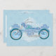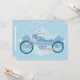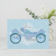 A motorcycle in shades of blue and purple with soft curves and swirls stands against white lattice on a blue floral background filling this biker wedding invitation with romance. From my original digitally-created image.